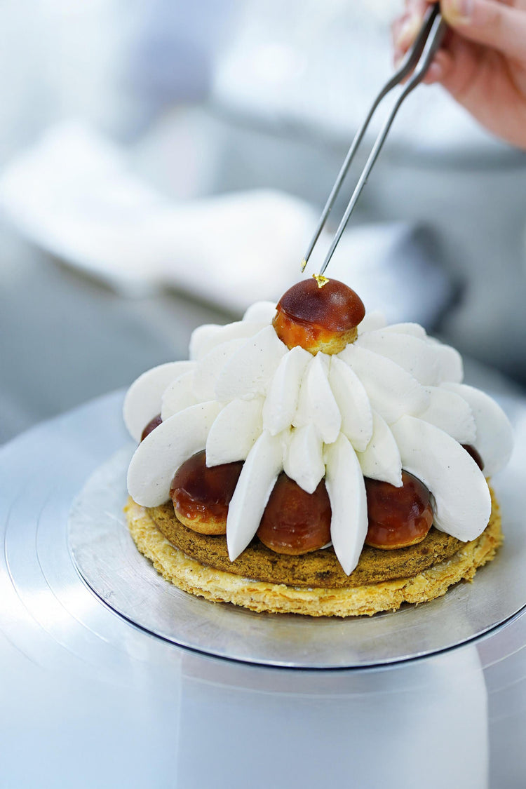以傳統的法式蛋糕 — Saint-Honoré 聖多諾黑為主調,以輕盈口感的雲呢拿卡士達醬,飽滿地注入每一顆亮晶閃耀的琥珀色焦糖泡芙中。每顆裹上焦糖外層的泡芙口感香脆,在泡芙之間擠上細膩幼滑的雲呢拿馬斯卡彭芝士忌廉作襯托。